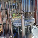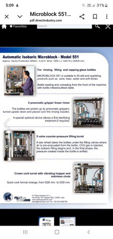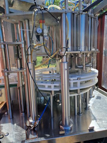 I6 head bottle filling machine, for rinsing, filling and capping bottles. Suitable for beer, wine or soft drinks, processes 50 bottler per hour. Fits crown caps of 26-29mm. Machine has 5 rinsing nozzles and 5 filling turrets.